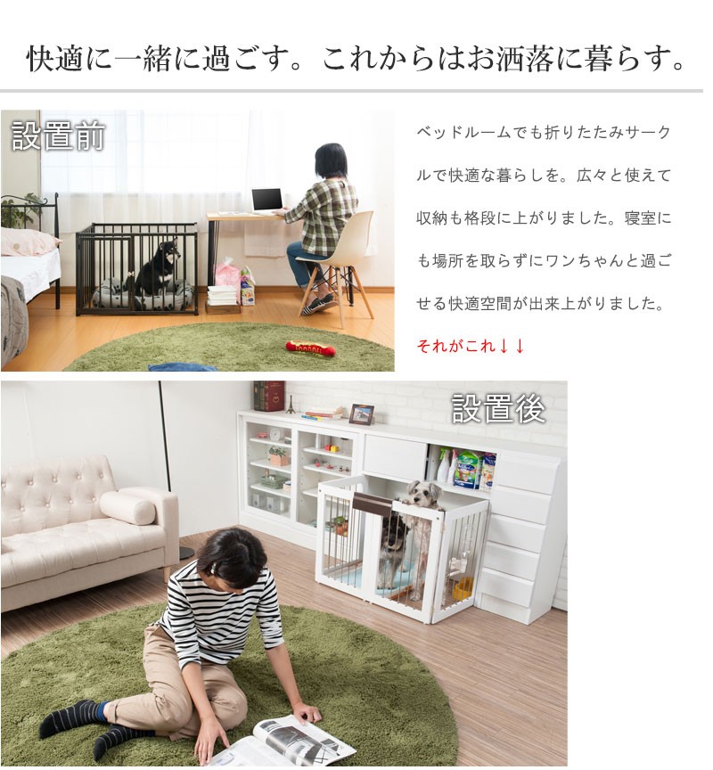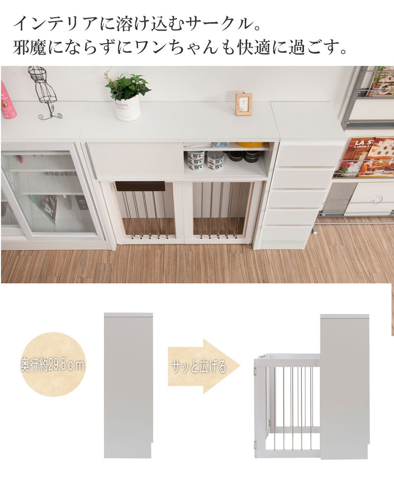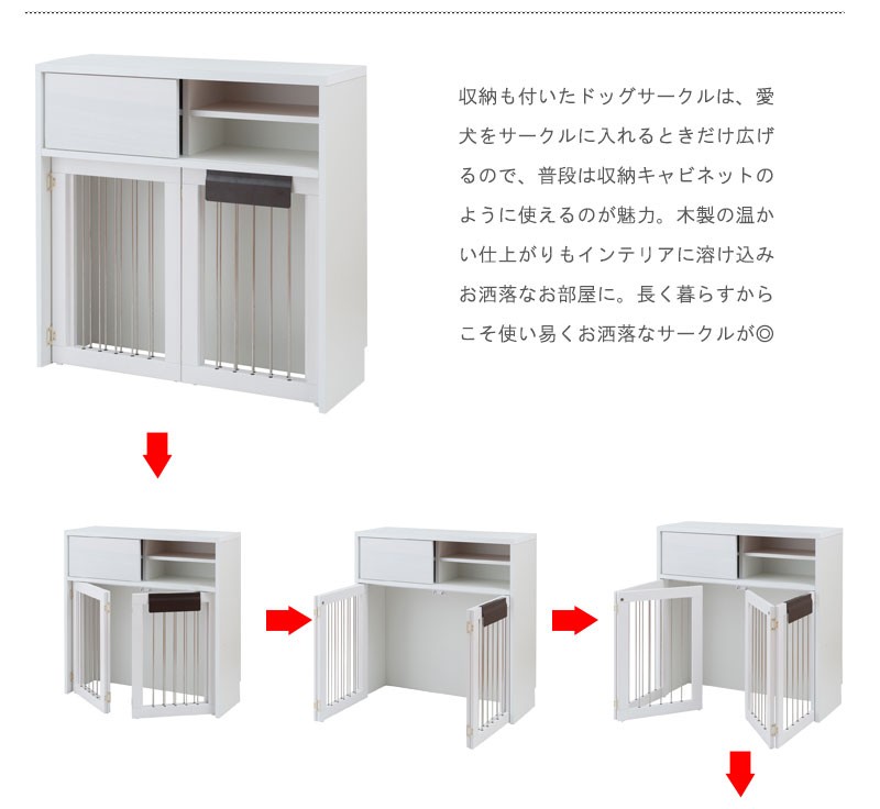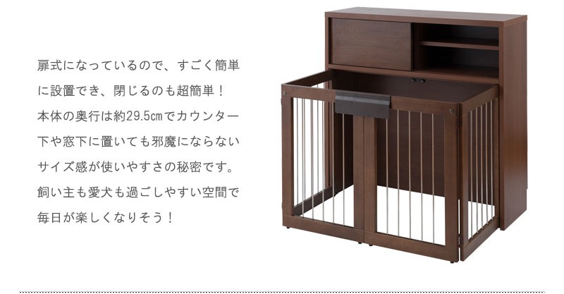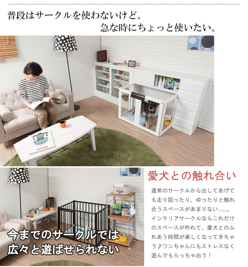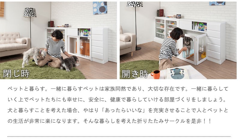 収納も付いたドッグサークルは 愛犬をサークルに入れるときだけ広げるので 普段は収納キャビネットのように使えるのが魅力