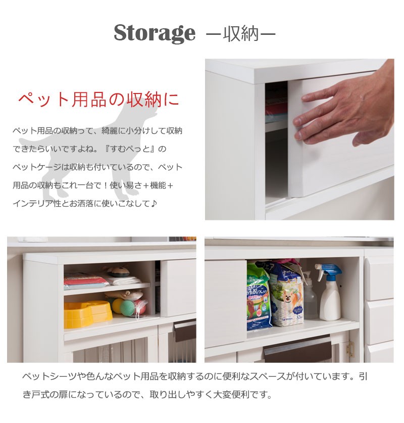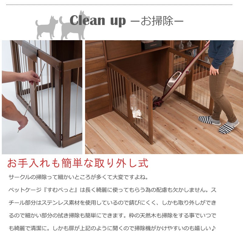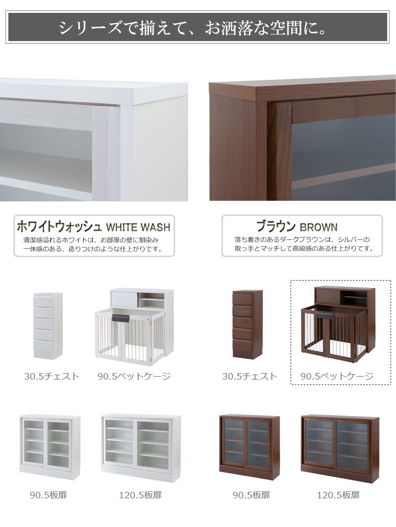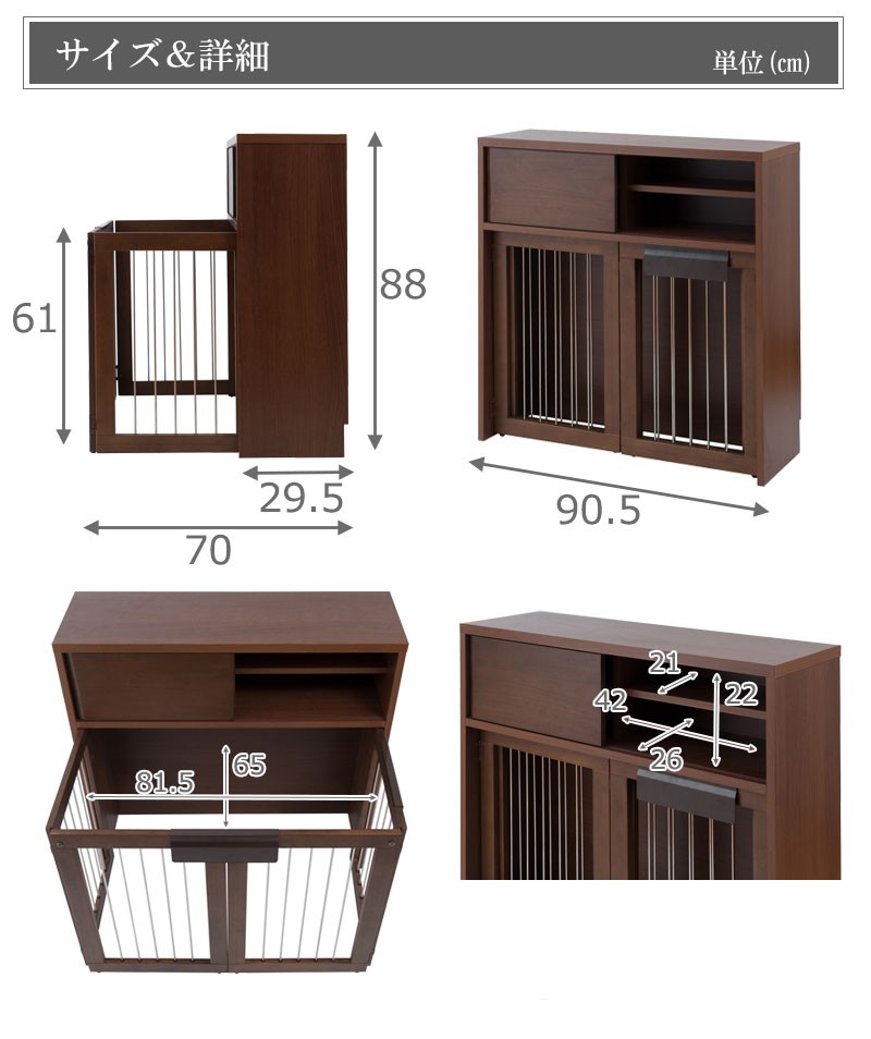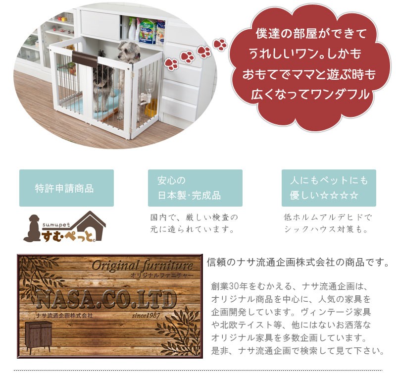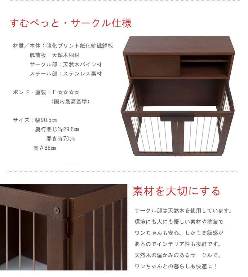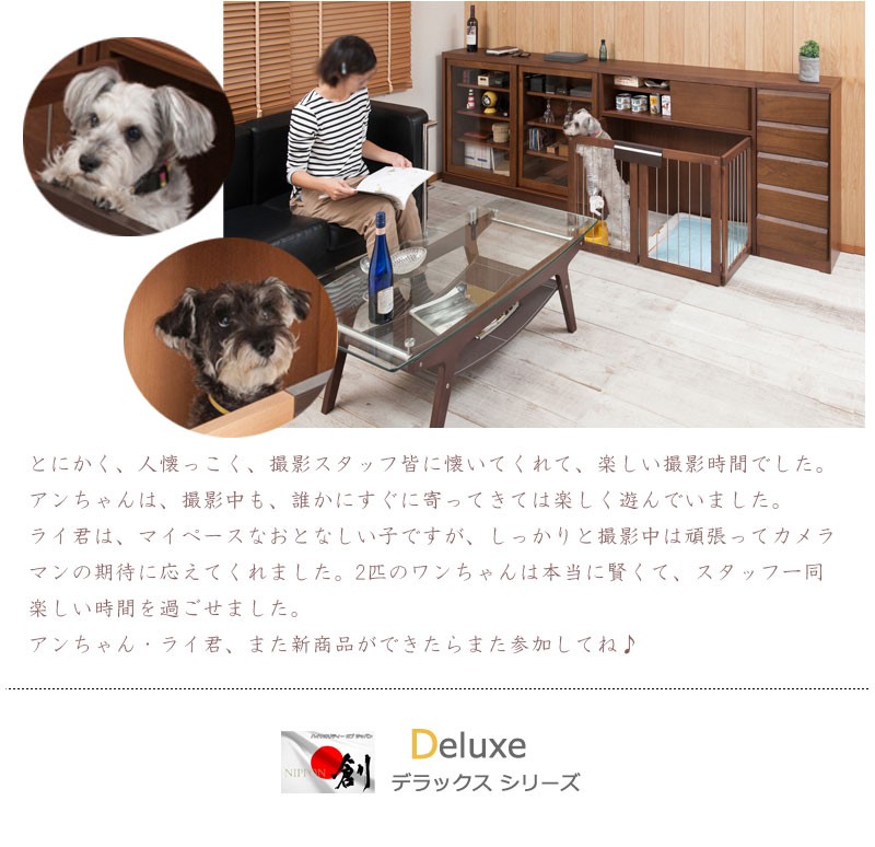 圧迫感がなく、シンプルデザインに仕上げたDELUXシリーズ。木製ワンタッチでたたんでしまえる収納型ケージ。インテリア性も兼ねたペット家具『すむぺっとシリーズ』。収納も付いたドッグサークルは、愛犬をサークルに入れるときだけ広げるので、普段は収納キャビネットのように使えるのが魅力。本体の奥行は約29.5cmでカウンター下や窓下に置いても邪魔にならないサイズ感が使いやすさの秘密です。長く暮らすからこそ使い易くお洒落で、使う時だけ広げられる邪魔にならないサイズ感がGOOD。同デザインの家具と合わせて統一感のあるインテリアをつくれます。