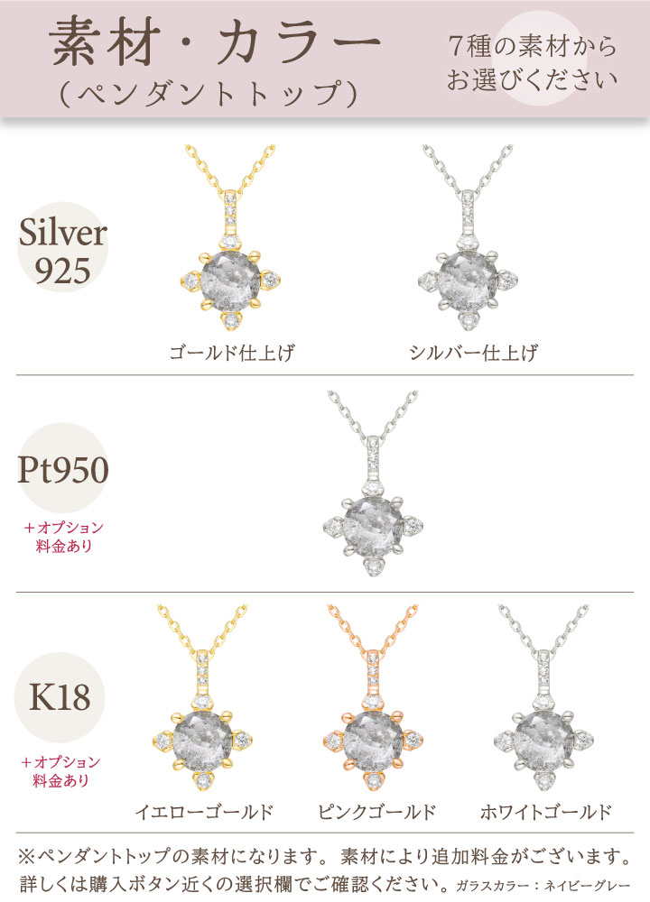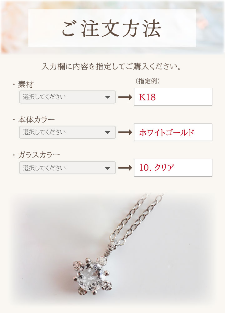 ● カラーガラスや金属素材の美しい状態を長く保つために、付属のクロスで軽く拭き取るお手入れをおすすめします。(研磨剤入りのジュエリークロスでこすると素材によってはメッキがはがれます。)