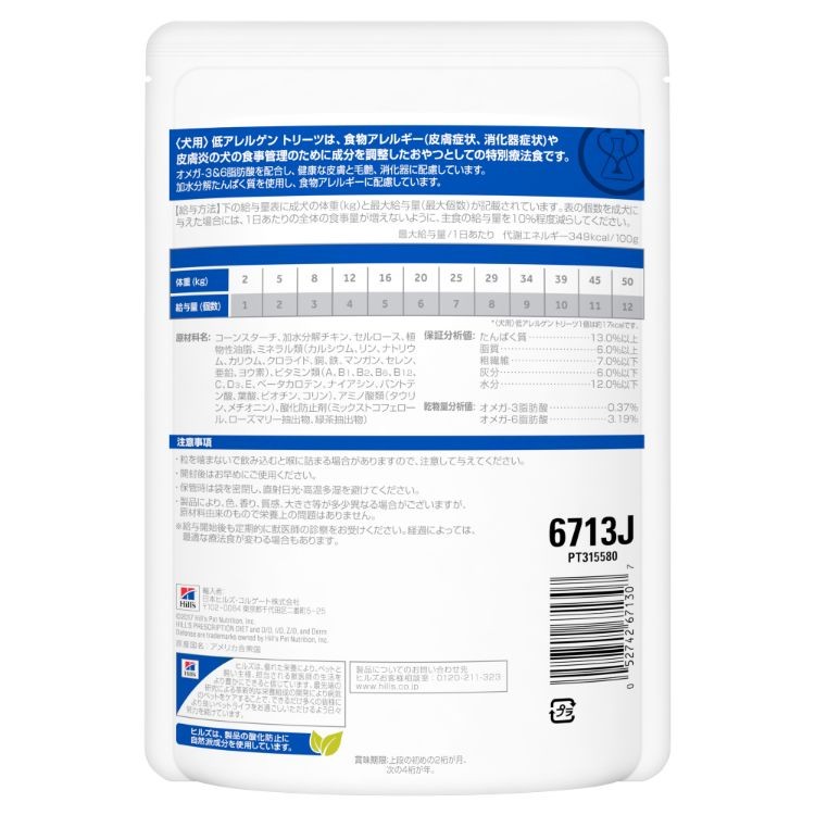 ヒルズ プリスクリプション・ダイエット ドッグフード 低アレルゲン トリーツ 犬用(プリスクリプションダイエット)/メーカーで選ぶ(50音順)/ブランド:ヒルズ プリスクリプション・ダイエット/【発売元、製造元、輸入元又は販売元】日本ヒルズ・コルゲート(療法食)/【ヒルズ プリスクリプション・ダイエット ドッグフード 低アレルゲン トリーツ 犬用の商品詳細】●犬用 低アレルゲン トリーツは、食物アレルギー(皮膚症状、消化症状)や皮膚炎の犬の食事管理のために成分を調整したおやつとしての特別療法食です。●プリスクリプション・ダイエット 犬用 z/d 、d/d 、i/d、i/dコンフォート、 ダーム ディフェンス製品を給与している犬へのおやつとして与えることができます。●必ず獣医師の指導のもとに給与してください。●食物アレルギーに配慮し健康的な消化を助けます。●皮膚、被毛の健康に配慮し、皮膚バリア機能を維持します。●健康をサポートし、免疫力を維持します。●食物アレルギーに配慮し、加水分解たんぱく質を使用●EPAを含むオメガ-3 & 6 脂肪酸を配合し、皮膚・被毛の健康をサポート●皮膚バリ.../cate10150