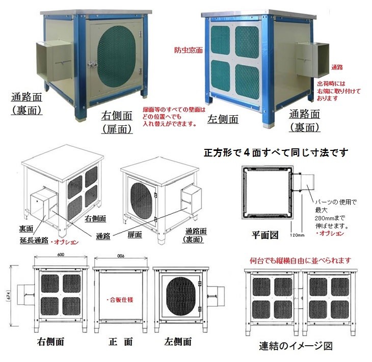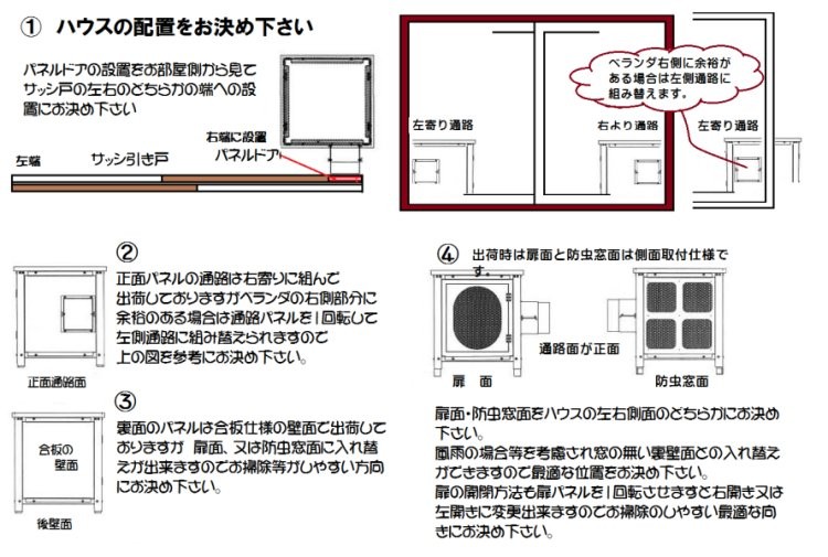 四面の壁面すべての窓(扉面・防虫網付き窓面・通路面)取り付け位置の入れ替え交換ができます。
