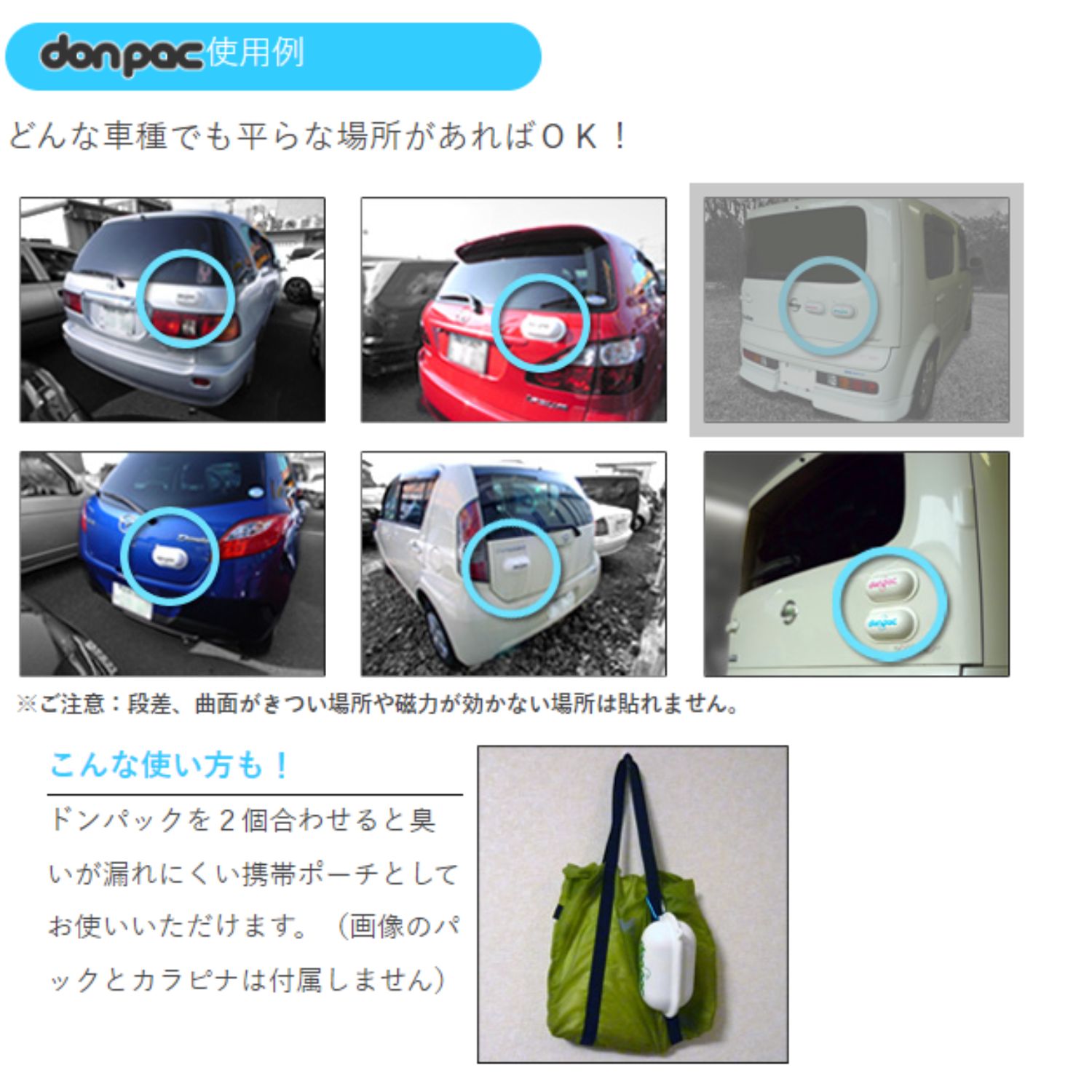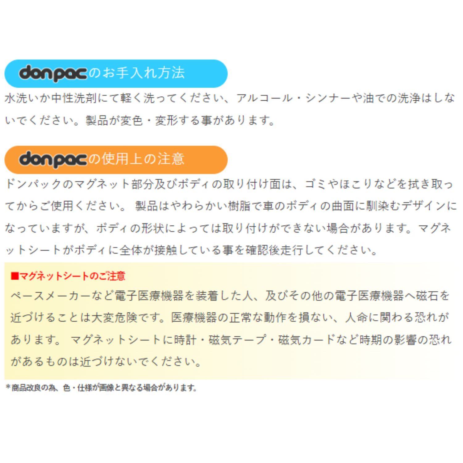 donpacのお手入れ方法水洗いか中性洗剤にて軽く洗ってください、アルコール・シンナーや油での洗浄はしないでください。製品が変色・変形する事があります。donpacの使用上の注意ドンパックのマグネット部分及びボディの取り付け面は、ゴミやほこりなどを拭き取ってからご使用ください。 製品はやわらかい樹脂で車のボディの曲面に馴染むデザインになっていますが、ボディの形状によっては取り付けができない場合があります。マグネットシートがボディに全体が接触している事を確認後走行してください。■マグネットシートのご注意ペースメーカーなど電子医療機器を装着した人、及びその他の電子医療機器へ磁石を近づけることは大変危険です。医療機器の正常な動作を損ない、人命に関わる恐れがあります。 マグネットシートに時計・磁気テープ・磁気カードなど時期の影響の恐れがあるものは近づけないでください。