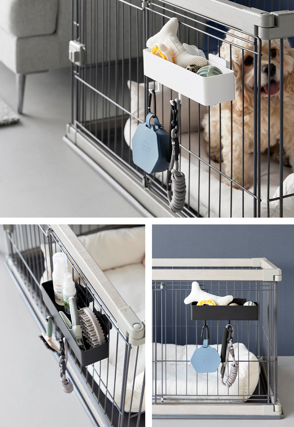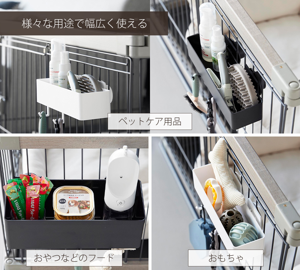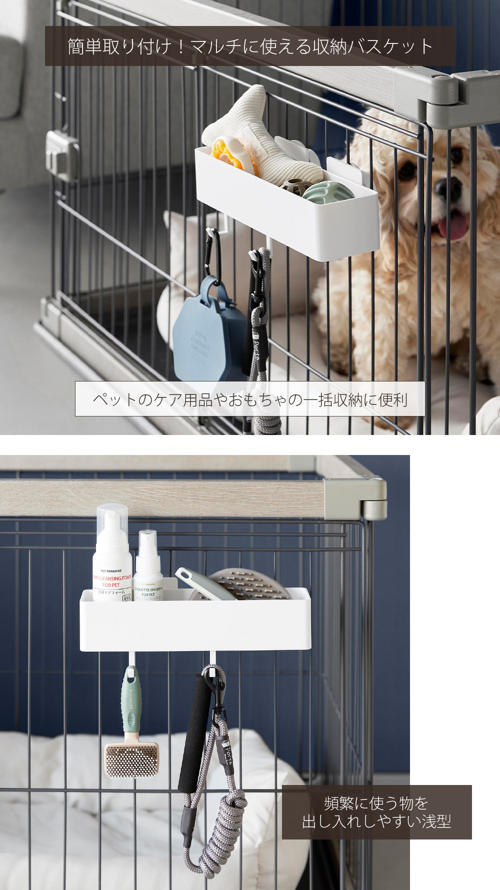 ペットケージに簡単に取り付けられる、便利な収納バスケットです。ペットケア用品やおもちゃなどを、まとめて収納できます。頻繁に使う物を出し入れしやすい浅型。
